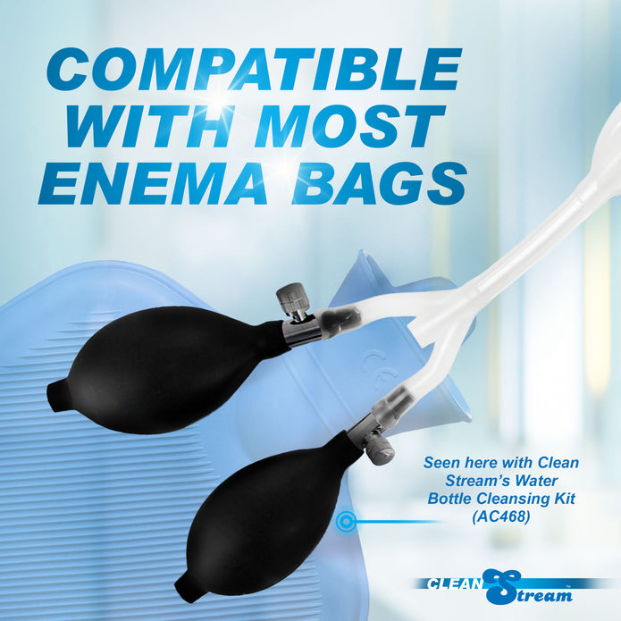 Make enema play more enjoyable with the CleanStream Silicone Double Bulb Nozzle. Each bulb is controlled by its own pump, allowing you to vary the size of each as desired. Simply insert the first bulb into your anus and leave the second one out. Doing this will create a seal, ensuring that any fluid inserted (up to 3500ml) will remain inside until you wish to let it out. Get cleansed and a good fill with this great new enema piece!