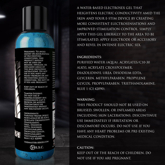 The Master Series Electrosex Gel is a conductive gel formulated to optimize electrical signal transmission between e-stim devices and the user's skin. The gel establishes a consistent conductive interface that reduces signal attenuation, eliminates hot spots, and improves stimulation control across the full intensity spectrum. The formula is tested and approved for both external application (surface electrodes, conductive rubber, pads, wands) and internal application (probes, plugs, electro dildos). The water-soluble, residue-free formula activates on contact and maintains conductive properties throughout extended sessions. The 8.5 oz (241 g) bottle is positioned as an essential add-on accessory for all e-stim product lines, supporting cross-sell opportunities with electrode kits, power boxes, and electro insertables. Phthalate-free formulation.