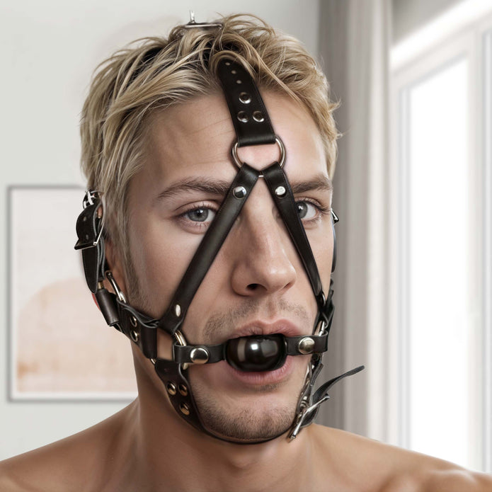 This ultra restrictive locking ball gag harness will make sure your sub will not be able to wriggle their way free. With straps running behind the head, one going under the chin, and one supporting the gag, your partner will be restrained from all angles. The straps have multiple points of adjustability to ensure a comfortable, tight fit. Made of sturdy, flexible leather and heavy duty metal hardware, this quality piece is as beautiful as it is effective.
