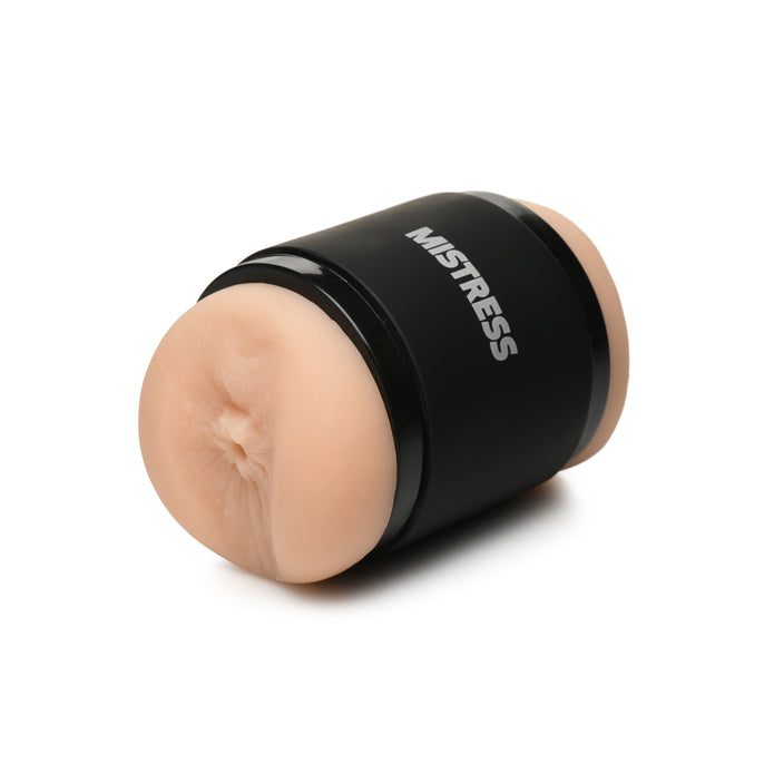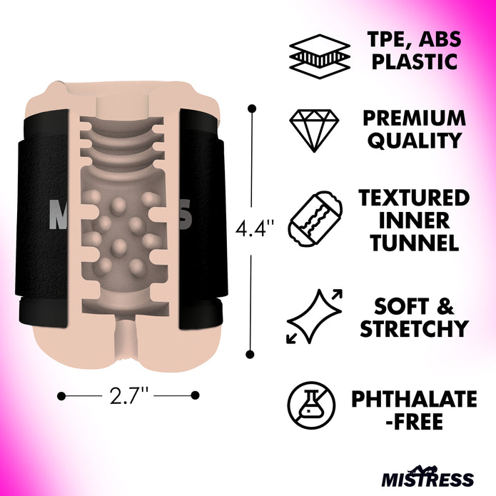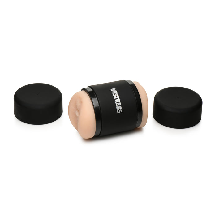 Stroke a juicy, tight butthole or plunge into a voluptuous vulva with this Mistress Mini Double Stroker! Designed so you can have both the front and back holes to fulfill your fantasy, it is also petite and travel friendly! Enjoy the realistic TPE rubber as the textured inner canal enfolds your shaft in blissful, wet, stimulating sensations! Make more of your intimate moments on the go or at home with a compact, easy to clean stroker! With open-ends on each side, you can plummet your peen through the hole or deeply into it and cum through it when you fully release! To clean, just rinse it out and use mild soap and warm water, then let it fully dry. Two caps are included - one for each end - and can be used as something to bump your head against if you want a little resistance. Enjoy the ridges, bumps and nubs from the stretchy and realistic stroker and only use water-based lubricants for best results!