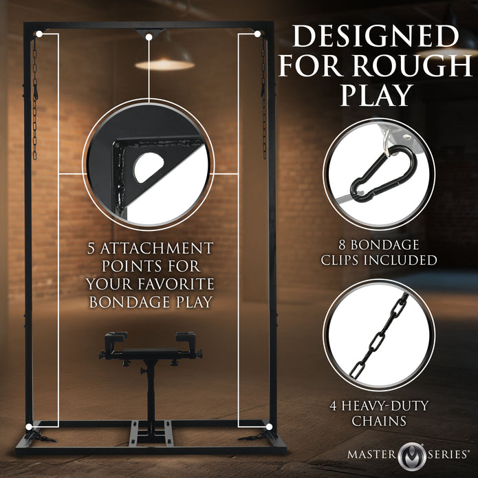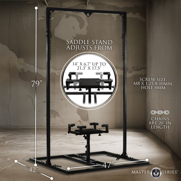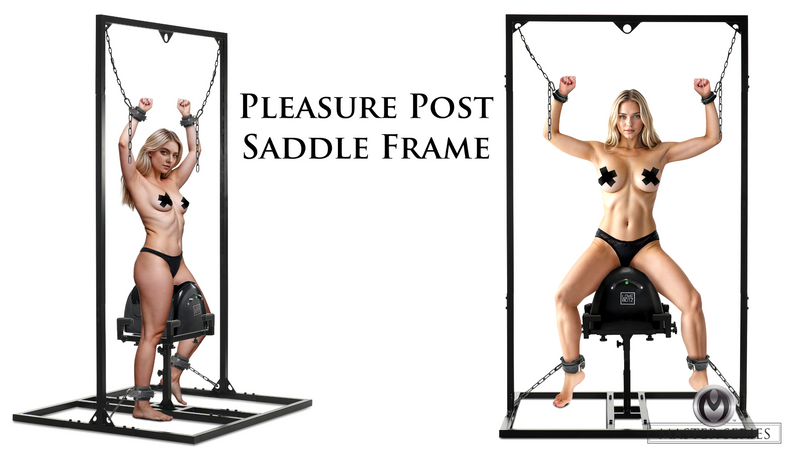 Designed for adventurous users, this sturdy adjustable frame allows standing or elevated positions while using a sex saddle without the need to kneel or bend low. Bring your submissive up to your level and please, punish, tease and tantalize them all while they are restrained by cuffs and chains to the frame! Built with a heavy-duty steel structure, it can handle extremely kinky sessions while offering maximum stability. Featuring 5 attachment points for wrist and ankle cuffs, along with chains and clips included, it’s perfect for fully customizable setups that give you the freedom to dominate the way you want. Lock the sex saddle in place, have them get on top, then restrain them so they can't wriggle free! They will have to submit completely to intense, erotic scenes while you use other toys, BDSM gear, or kinky tools on them as they receive uninterrupted pleasure. Compatible with nearly all saddle machines, this is a must-have upgrade for enhanced functionality and long-lasting use.