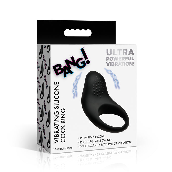 The Bang! Vibrating Silicone Cock Ring is a rechargeable couples vibrator built from premium body-safe silicone and ABS plastic. The soft clitoral stimulation pad sits flush against the body during penetration, delivering direct vibration to the clitoris from the same motor that the wearer feels through the ring. Ten vibration functions — four speeds and six patterns — give both partners full control over intensity and sensation, from a subtle, shared buzz to strong, focused vibration that builds toward climax. The 1.4" stretch silicone ring maintains firm, consistent positioning throughout wear, keeping the stimulation pad in contact exactly where it counts. Splash proof for easy cleanup. USB rechargeable, 90-minute charge, 60-minute run time. Phthalate-free throughout.